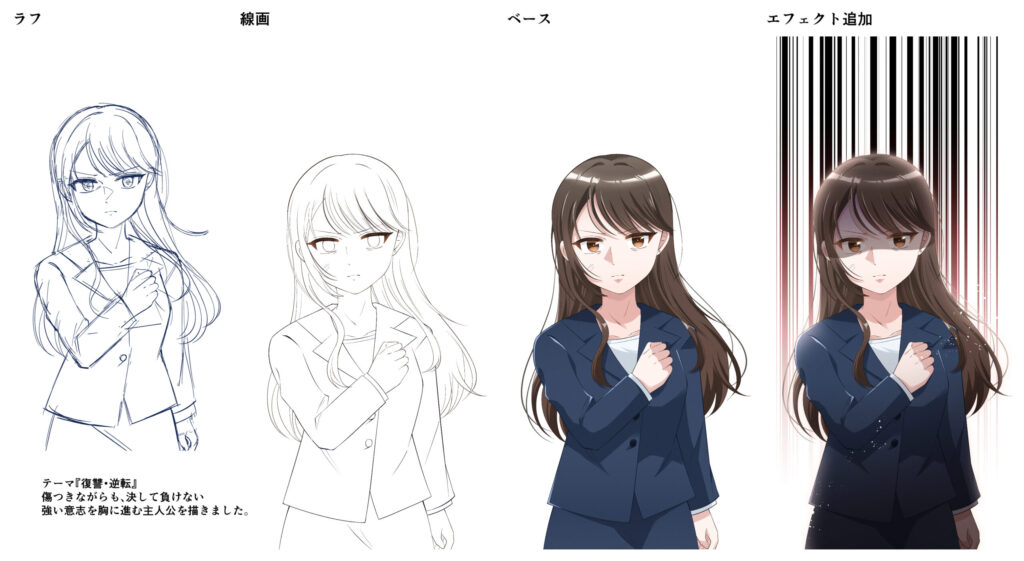 2025.11.21 オリジナル 復讐系風作品『下書き~仕上げ』 柚月 テーマ『復讐・逆転』傷つきながらも、決して負けない強い意志を胸に進む主人公を描きました。 制作期間:2025年10月制作時間:・下書き30分・線画1時間9分・ベース塗り1時間23分・エフェクト追加13分 下書き 線画 ベース エフェクト追加